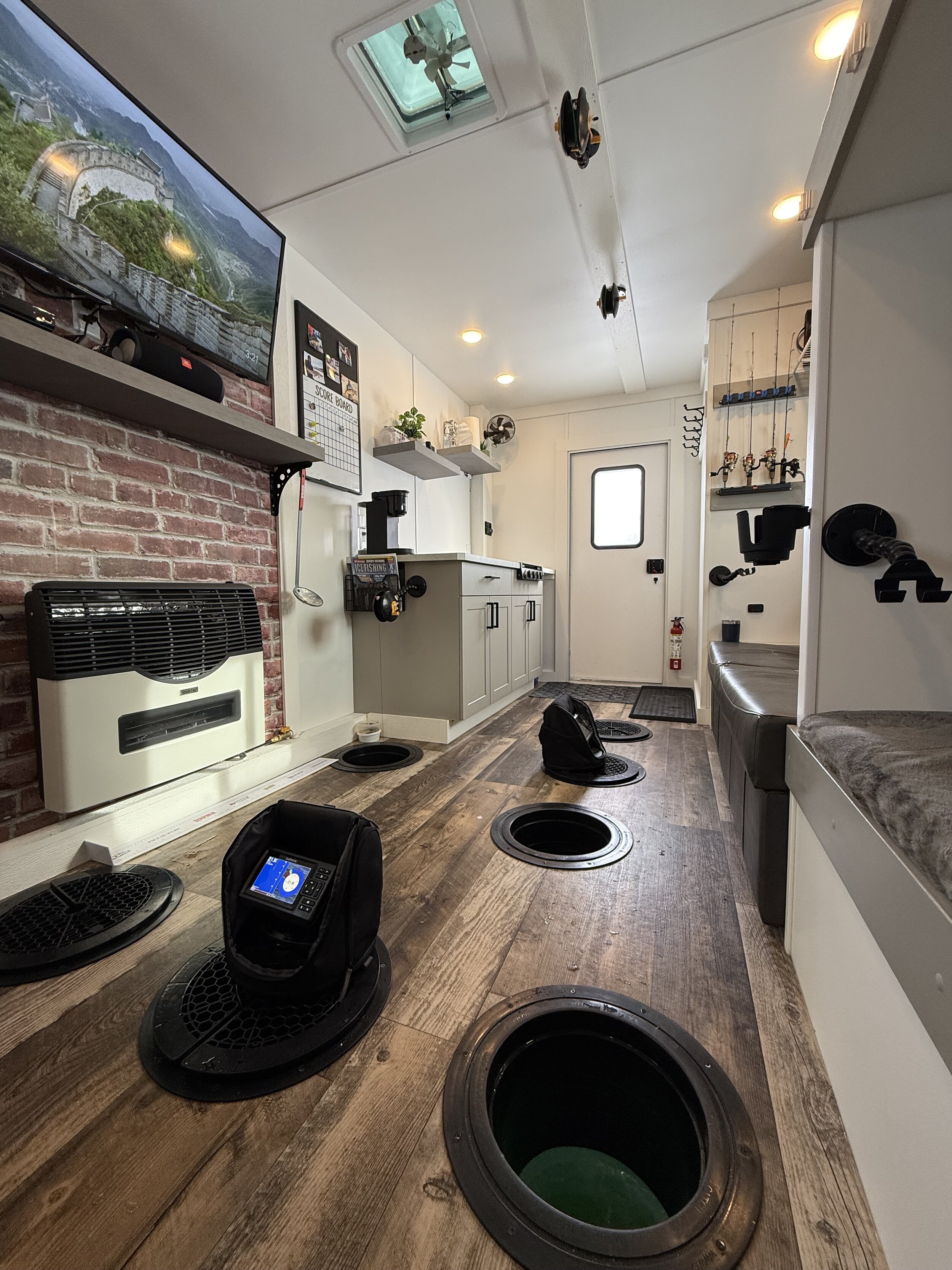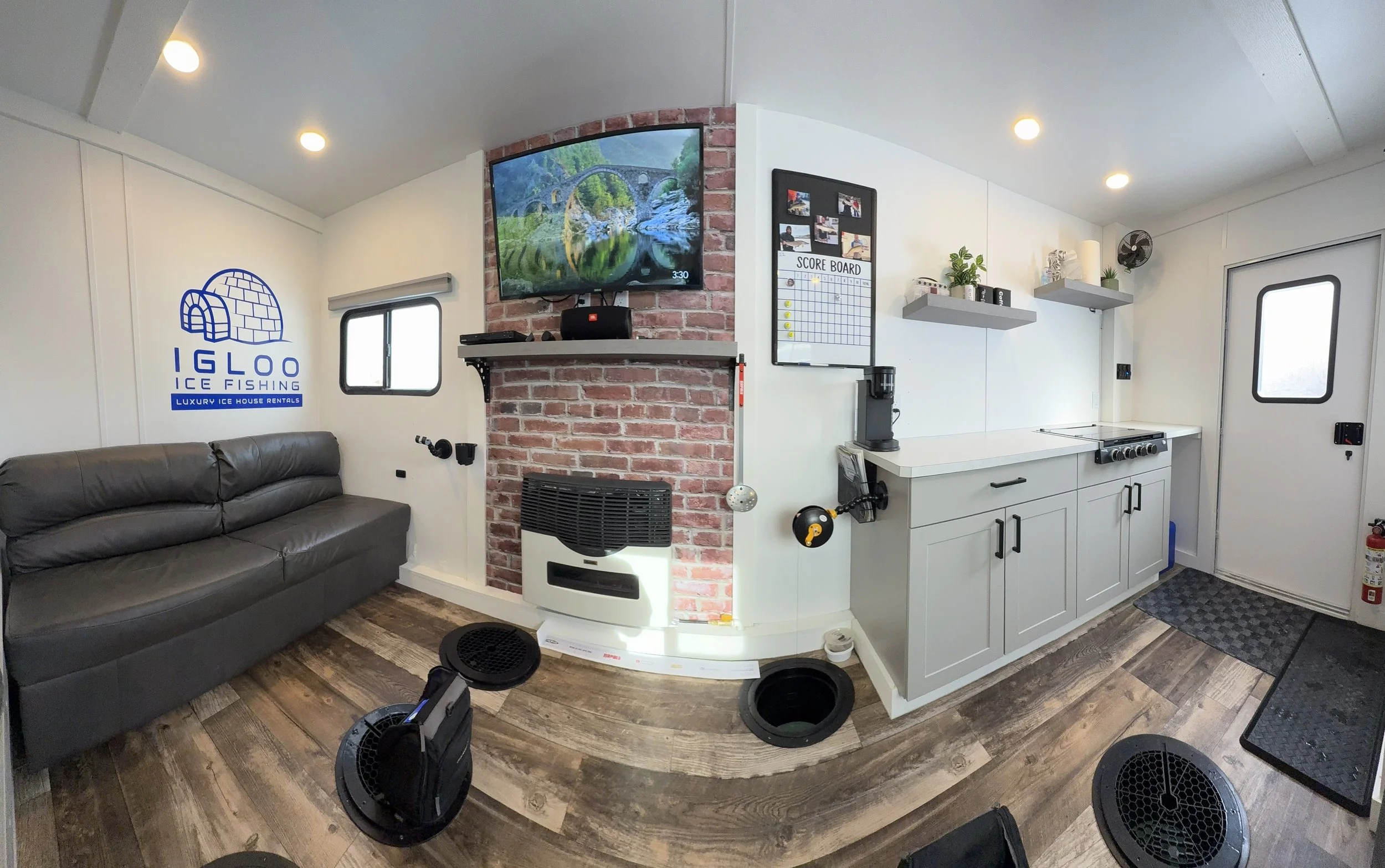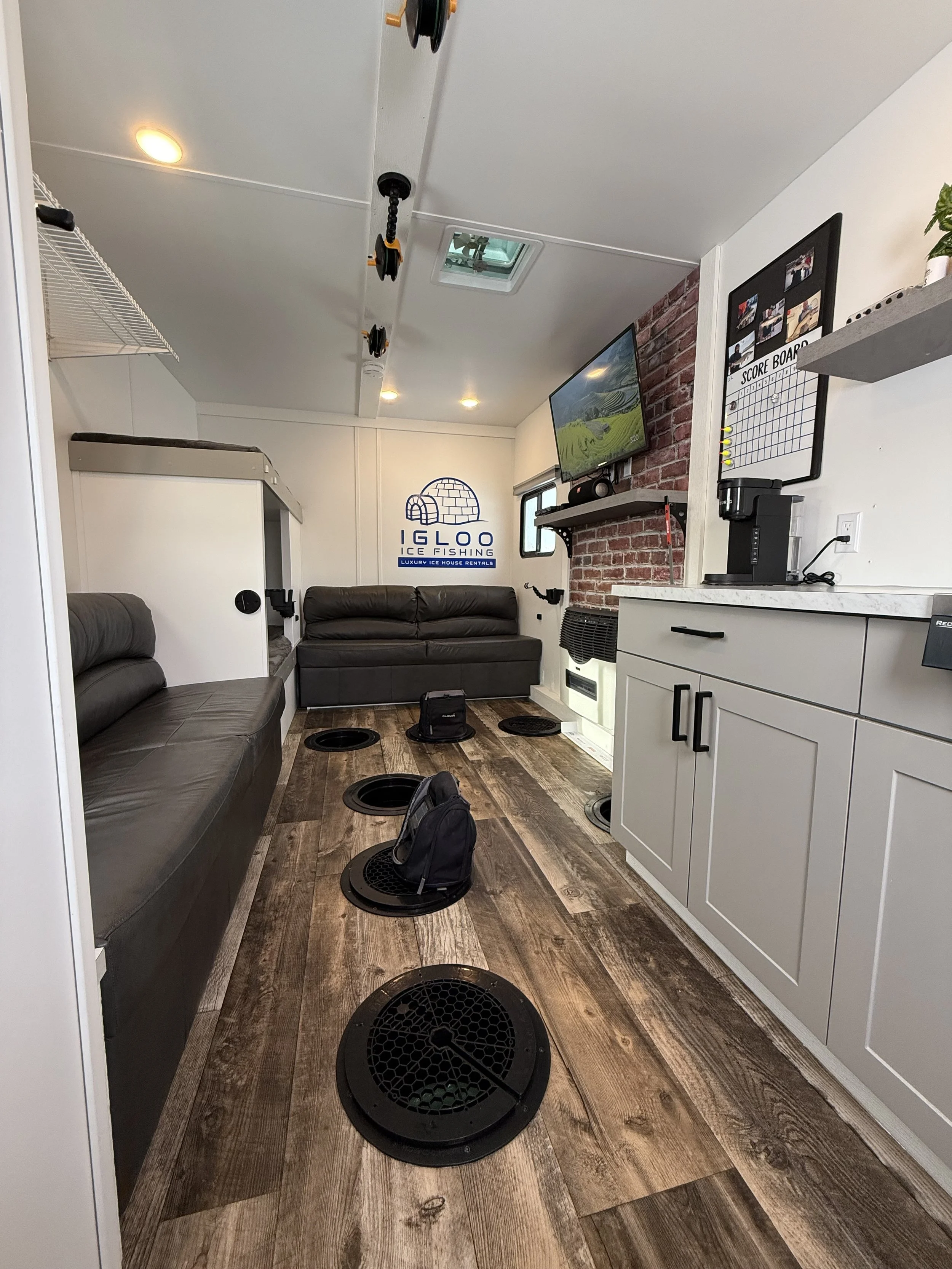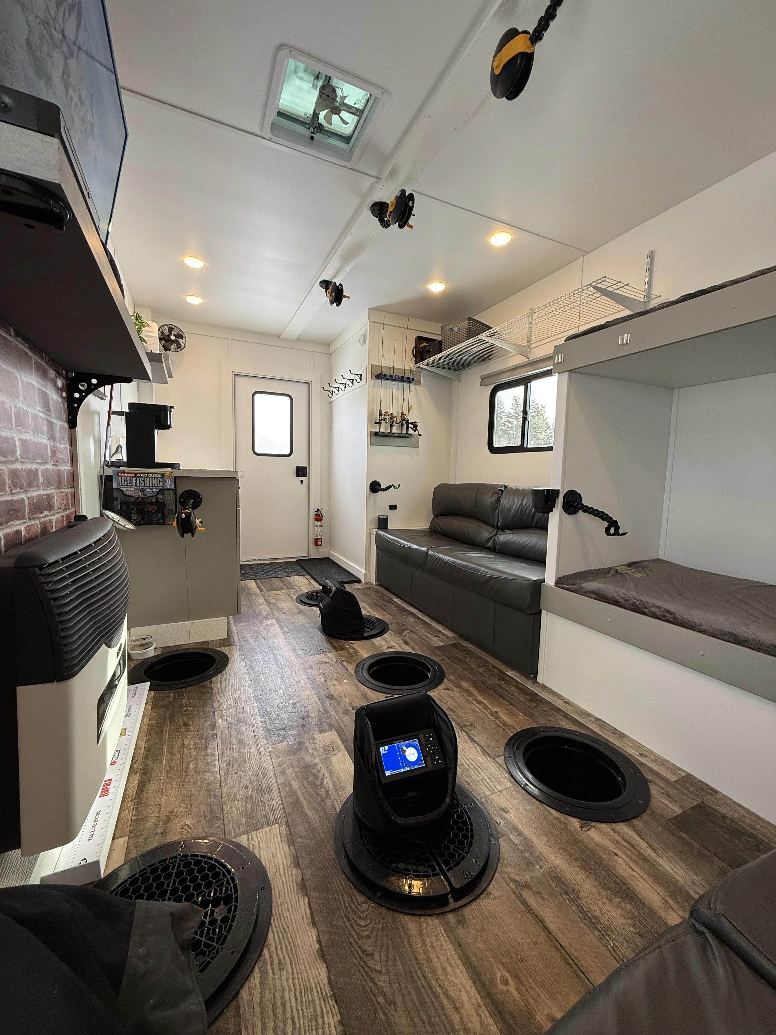 Stay warm and enjoy fishing on even the coldest days in our 8’x16' custom built luxury ice house. Our spacious heated ice house provides a comfortable and cozy environment for guest to stay warm, allowing you to focus on the thrill of fishing without the biting cold affecting your experience. With ample space to move around and a carefully planned layout, our luxury ice house offers the perfect setting for a memorable ice fishing adventure.