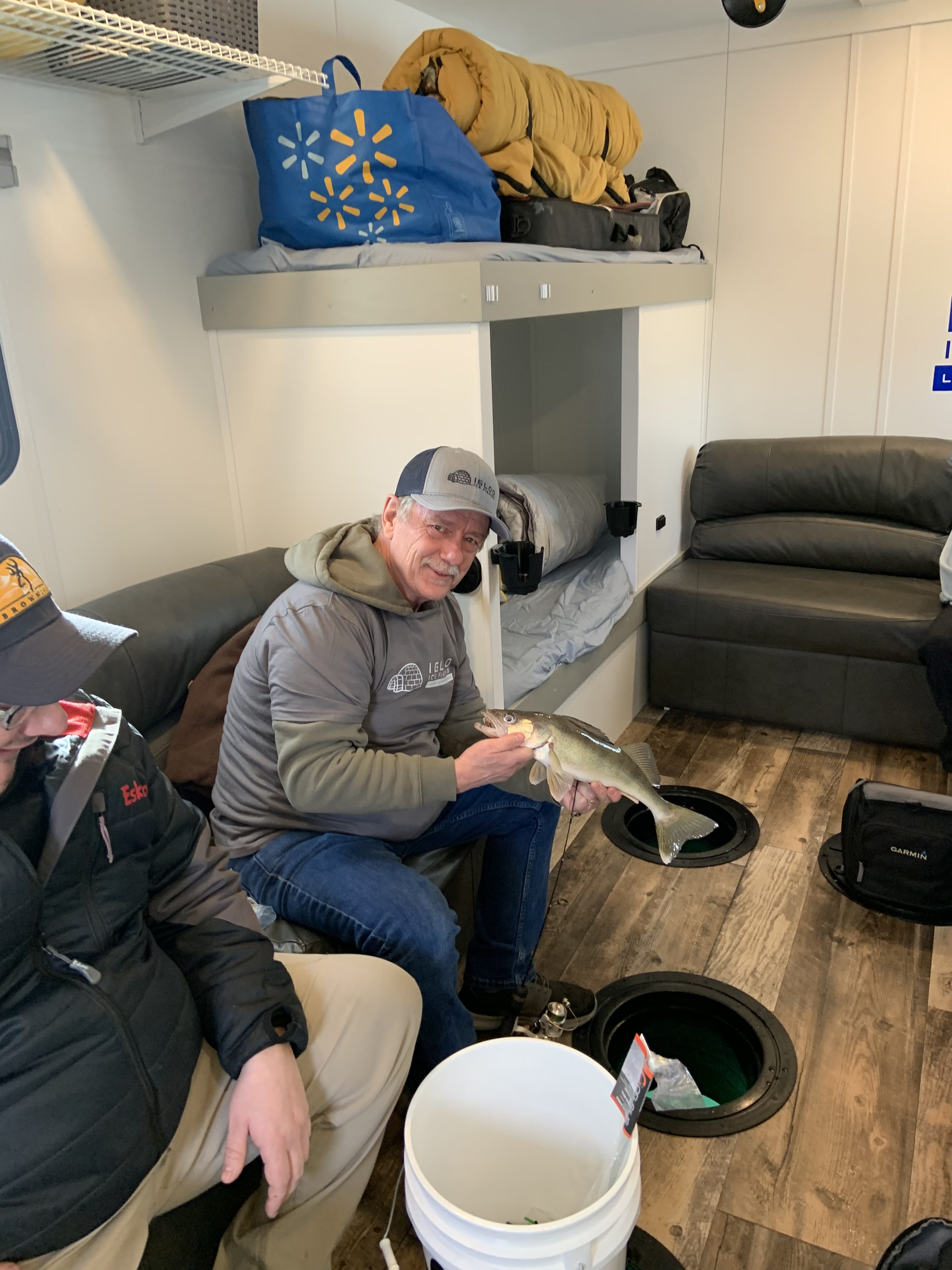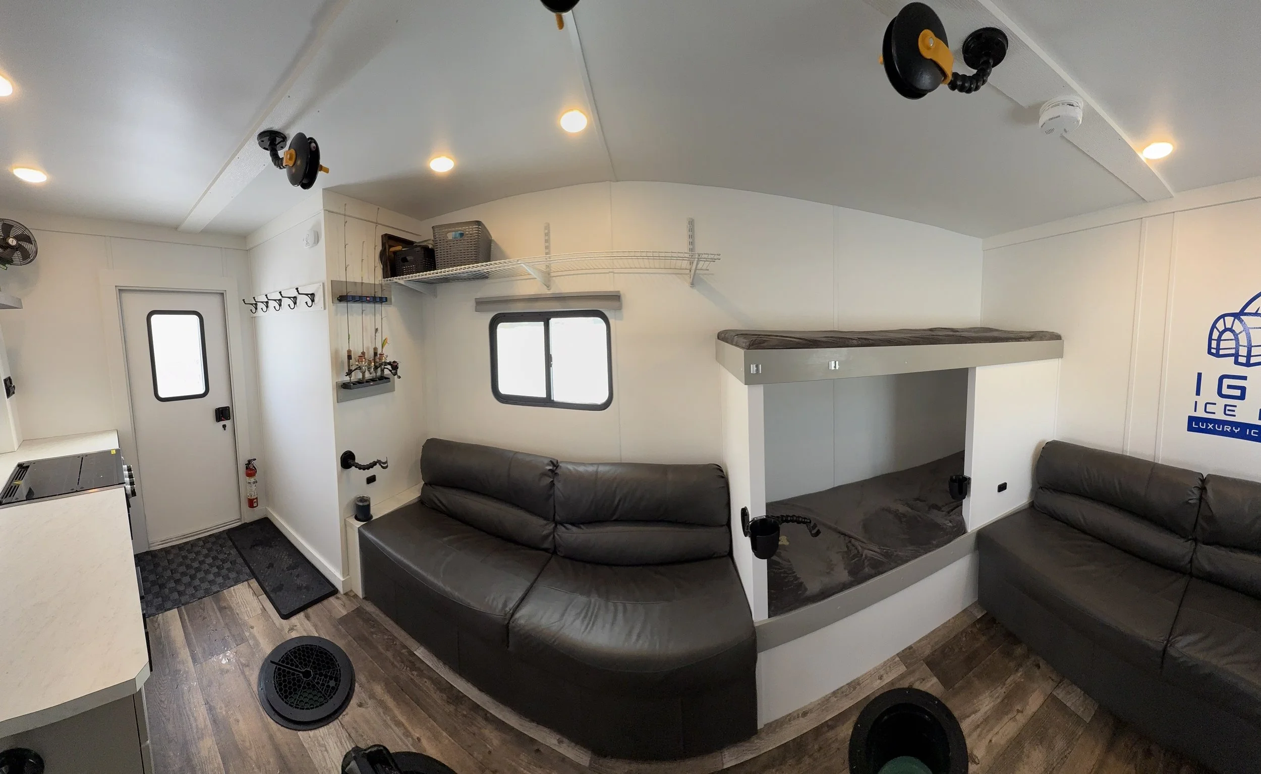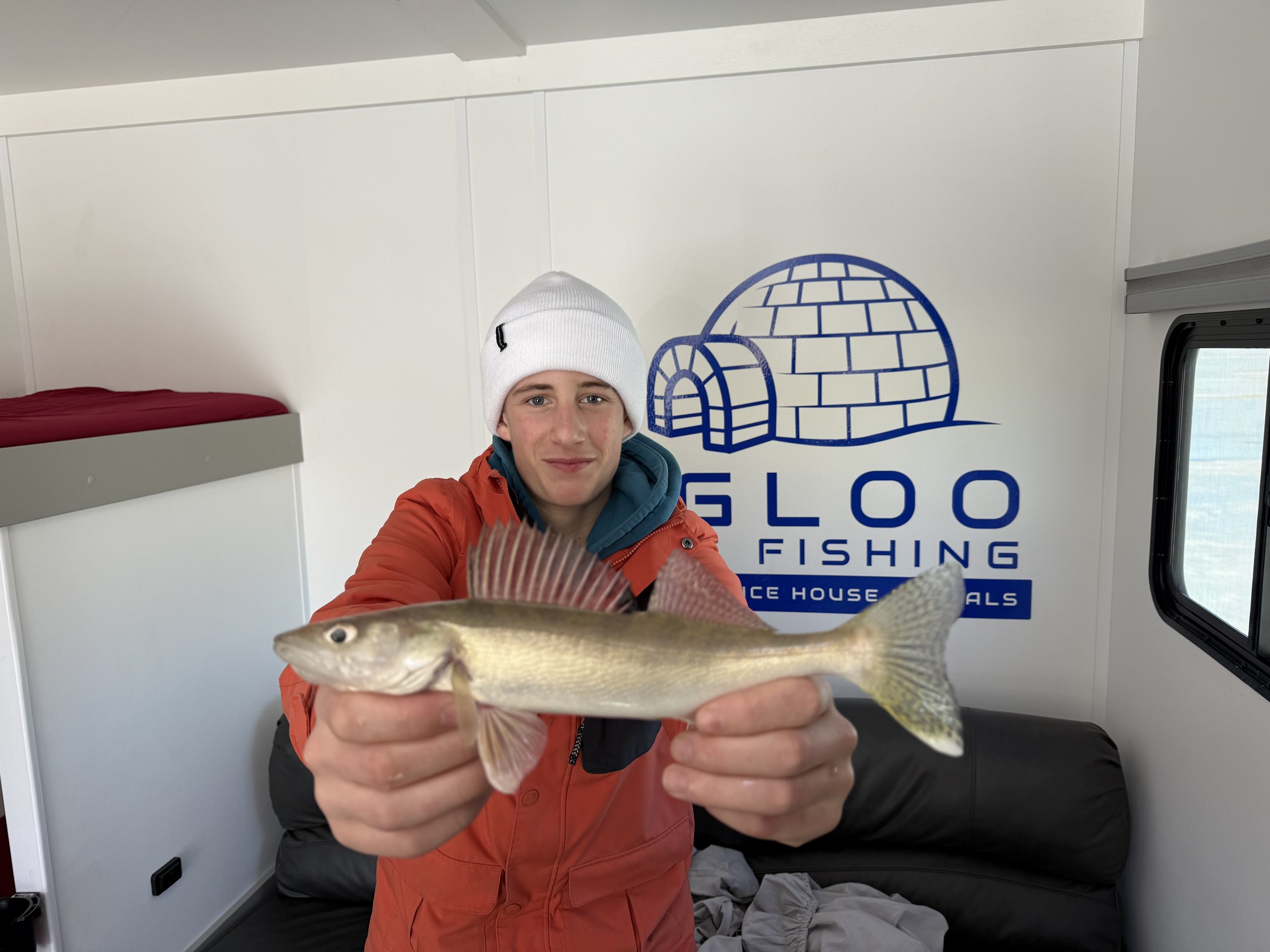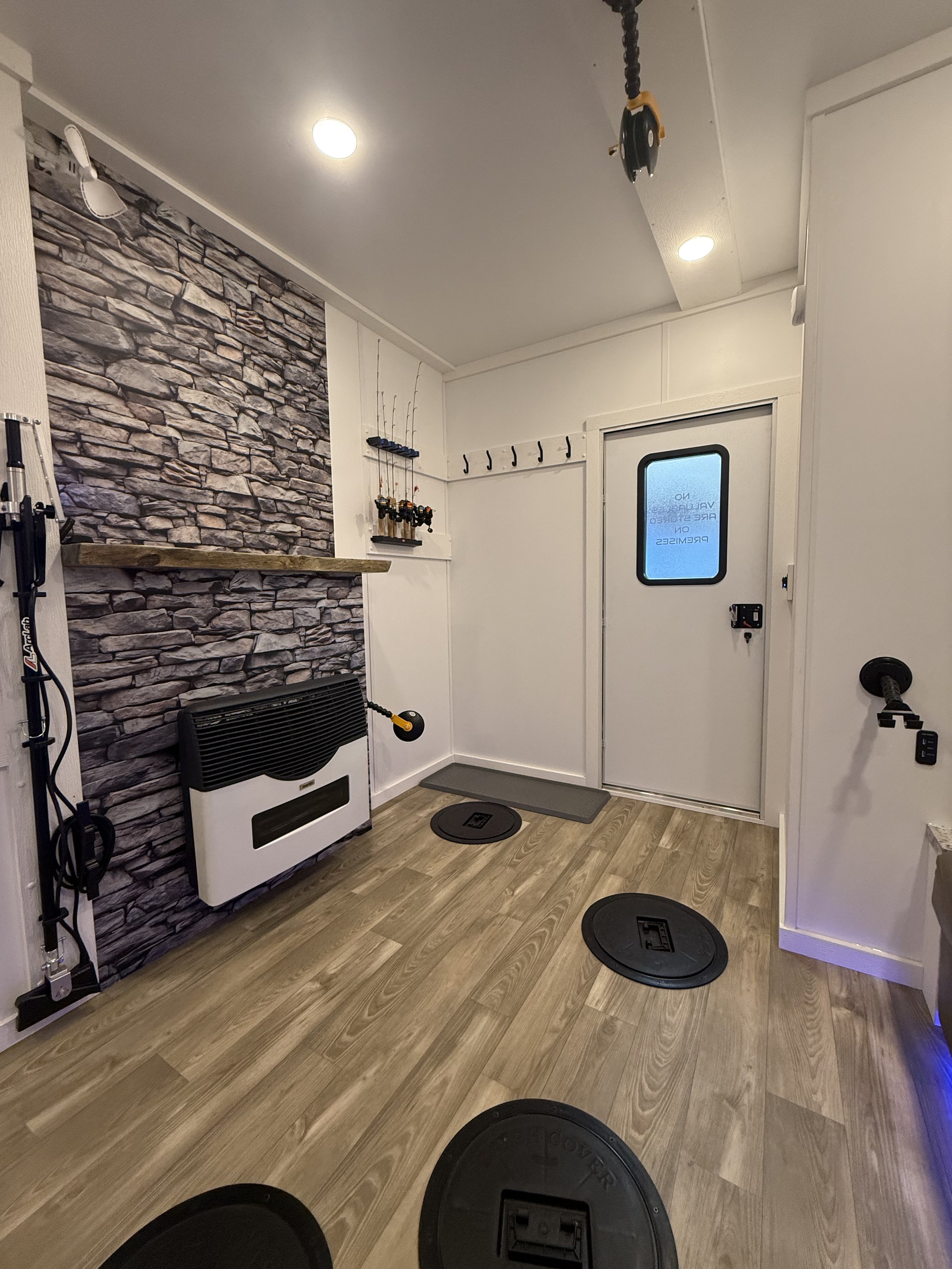 Stay warm and enjoy fishing on even the coldest days in our 8’x16' custom built luxury ice house. Our spacious heated ice house provides a comfortable and cozy environment for guest to stay warm, allowing you to focus on the thrill of fishing without the biting cold affecting your experience. With ample space to move around and a carefully planned layout, our luxury ice house offers the perfect setting for a memorable ice fishing adventure.
