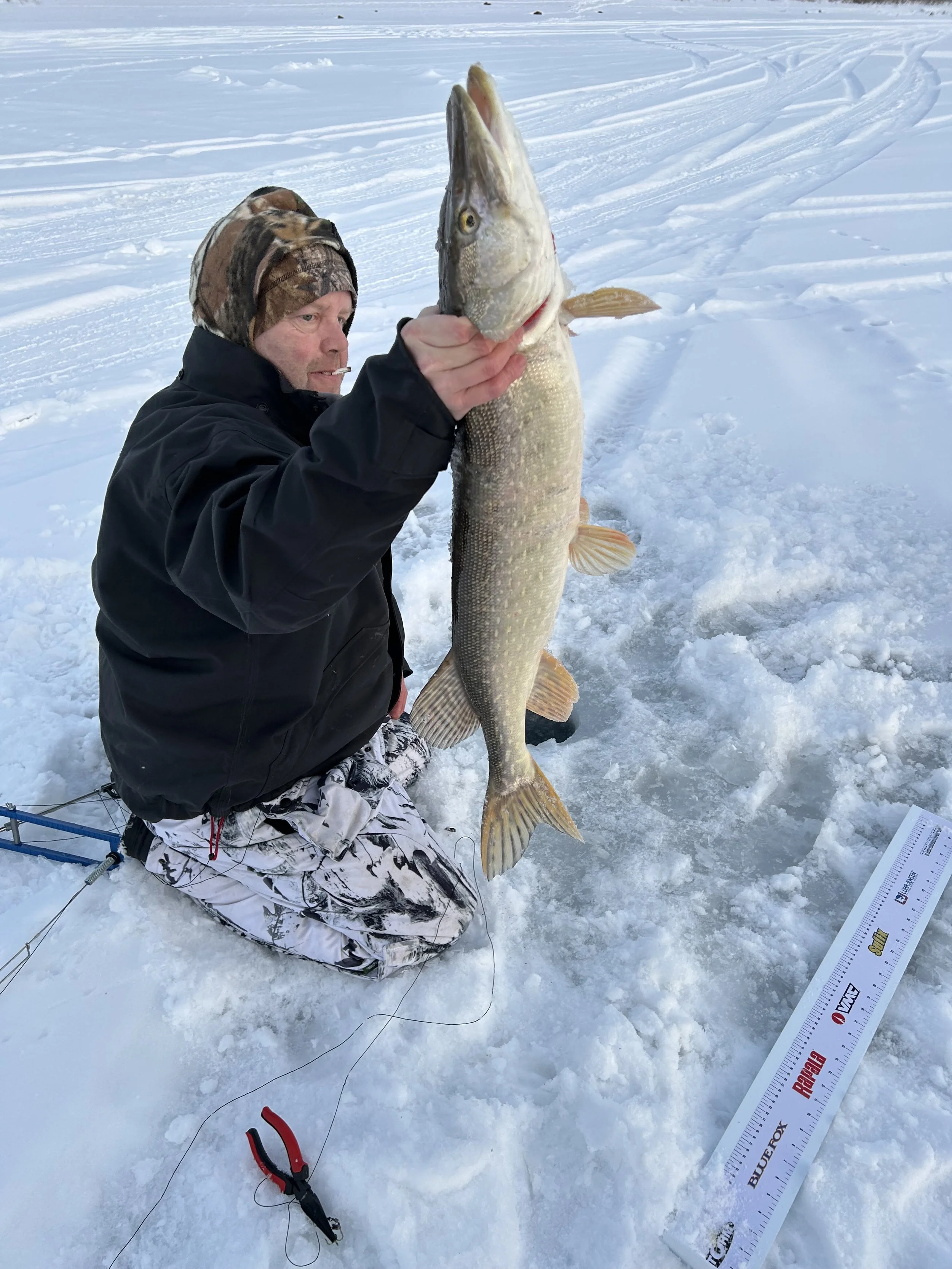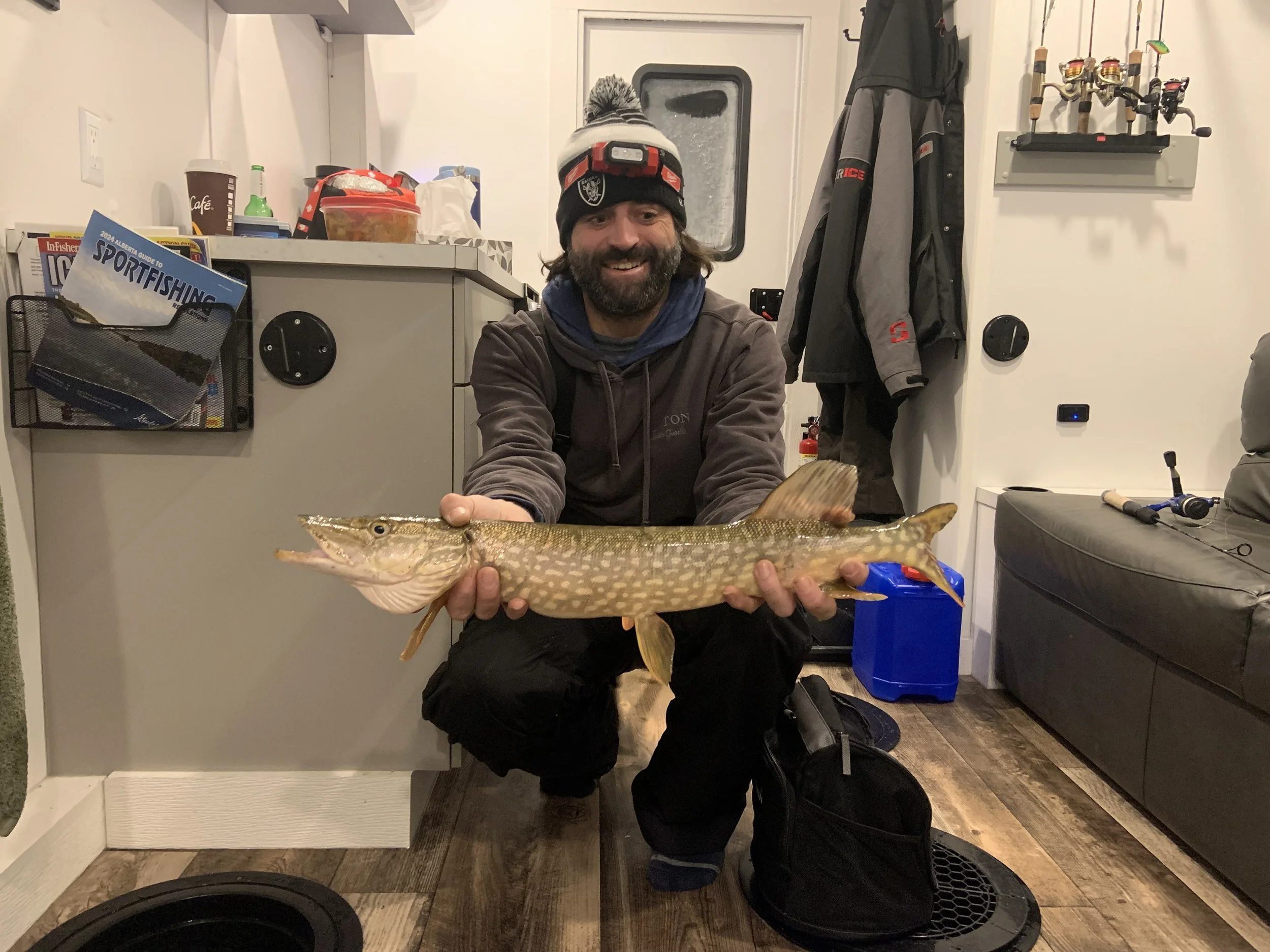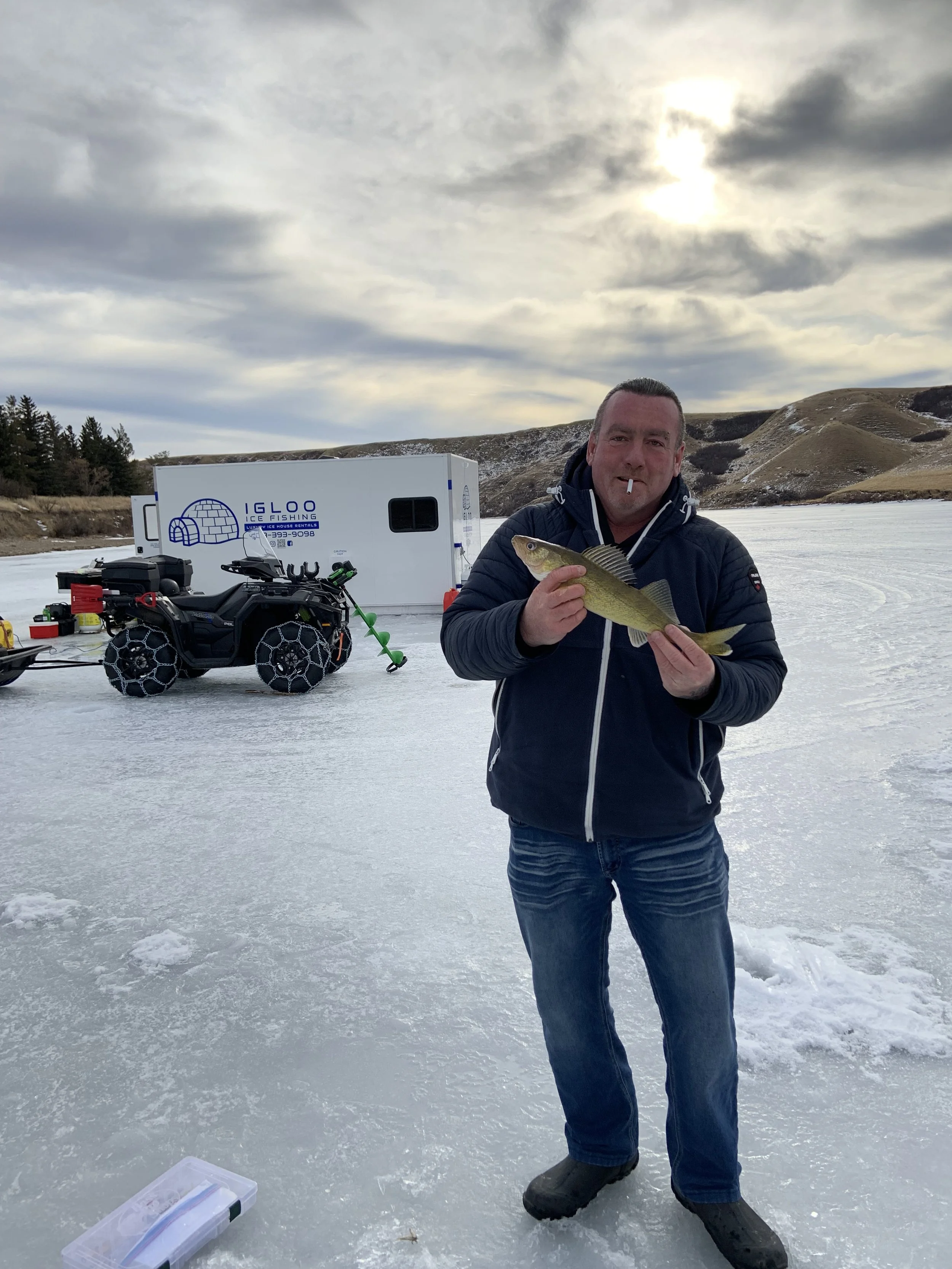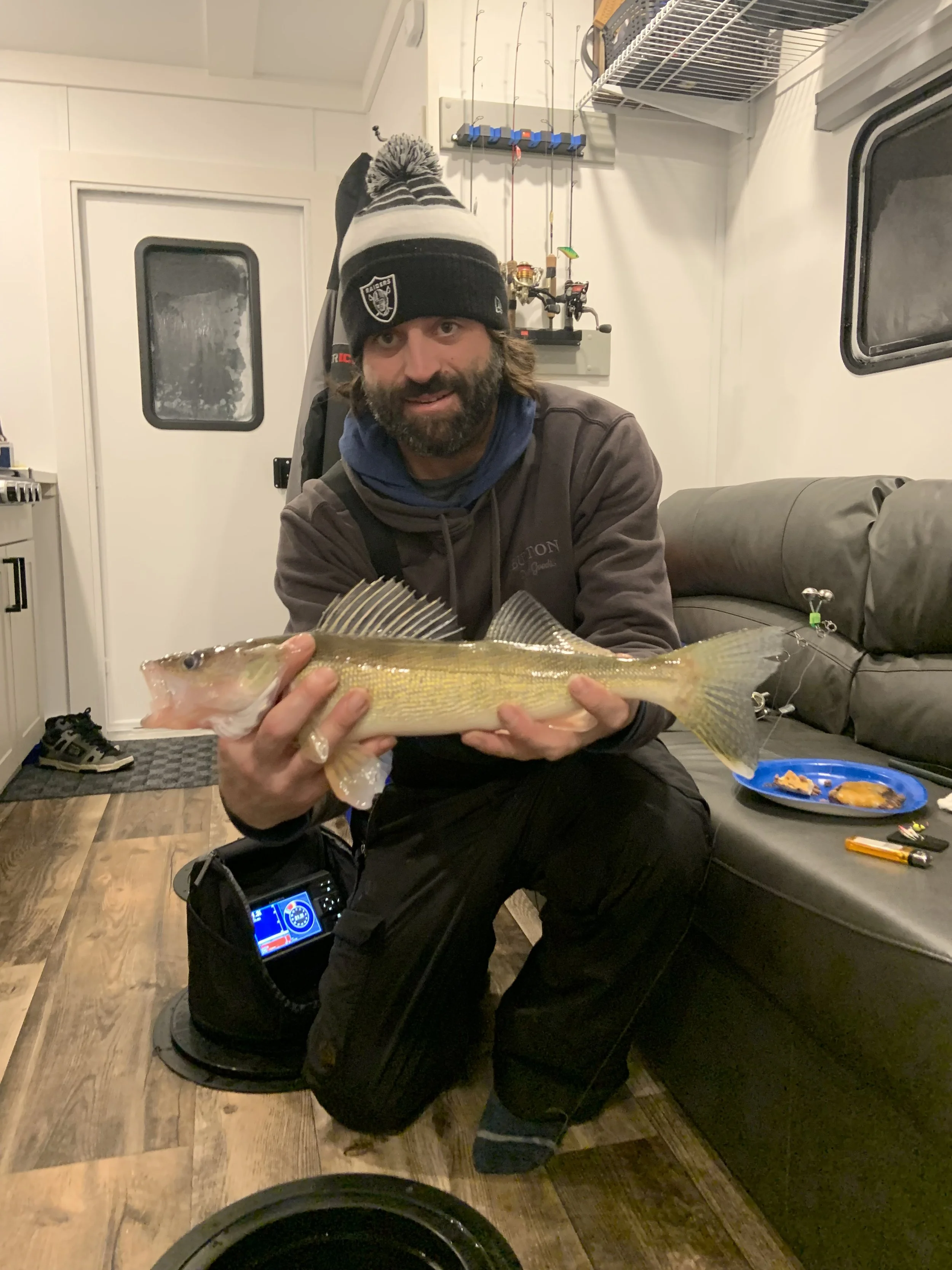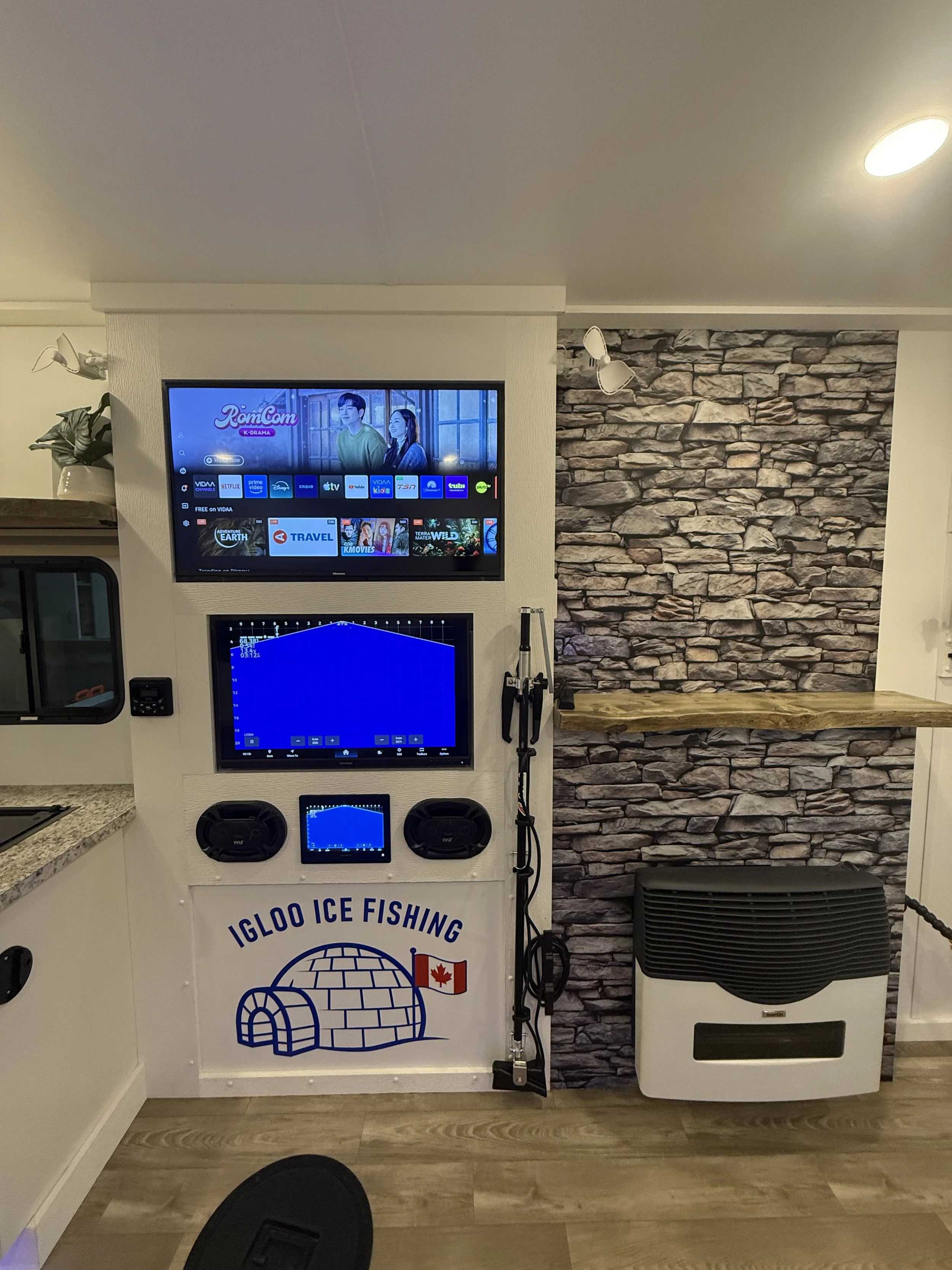 Stay warm and enjoy fishing on even the coldest days in our 8’x16' custom built luxury ice house. Our spacious heated ice house provides a comfortable and cozy environment for guest to stay warm, allowing you to focus on the thrill of fishing without the biting cold affecting your experience. With ample space to move around and a carefully planned layout, our luxury ice house offers the perfect setting for a memorable ice fishing adventure.